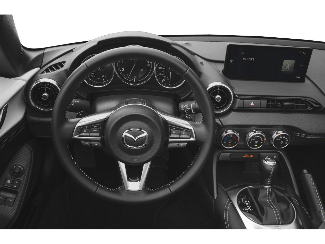 Jet Black Mica 2025 Mazda MX-5 Miata Grand Touring RWD 6-Speed Automatic 17 x 7 aluminum alloy wheels with black metallic finish, 4-Wheel Disc Brakes, 9 Speakers, ABS brakes, Air Conditioning, Alloy wheels, AM/FM radio: SiriusXM, AppLink/Apple CarPlay and Android Auto, Auto High-beam Headlights, Auto-dimming door mirrors, Auto-dimming Rear-View mirror, Automatic temperature control, black lug nuts and black wheel locks, bose audio system with audiopilot, Brake assist, Bumpers: body-color, cargo net, Convertible roof lining, Convertible roof wind blocker, Delay-off headlights, Driver vanity mirror, Dual front impact airbags, Dual front side impact airbags, Electronic Stability Control, Emergency communication system: MAZDA CONNECT, Exterior Parking Camera Rear, Four wheel independent suspension, Front anti-roll bar, Front Bucket Seats, Front Center Armrest, Fully automatic headlights, Garage door transmitter: HomeLink, Glass rear window, Heated door mirrors, heated front bucket seats, Heated front seats, Illuminated entry, Leather Shift Knob, leather upholstery, Low tire pressure warning, MAZDA CONNECT Infotainment system, Navigation System, Occupant sensing airbag, Outside temperature display, Panic alarm, Passenger vanity mirror, Power door mirrors, Power steering, Power windows, Radio data system, Rain sensing wipers, Rear anti-roll bar, Rear window defroster, Remote keyless entry, Speed control, Speed-sensing steering, Sport steering wheel, Steering wheel mounted audio controls, Tachometer, Telescoping steering wheel, Tilt steering wheel, Traction control, Trip computer, and Variably intermittent wipers. 2.0L 4-Cylinder DOHC 16V