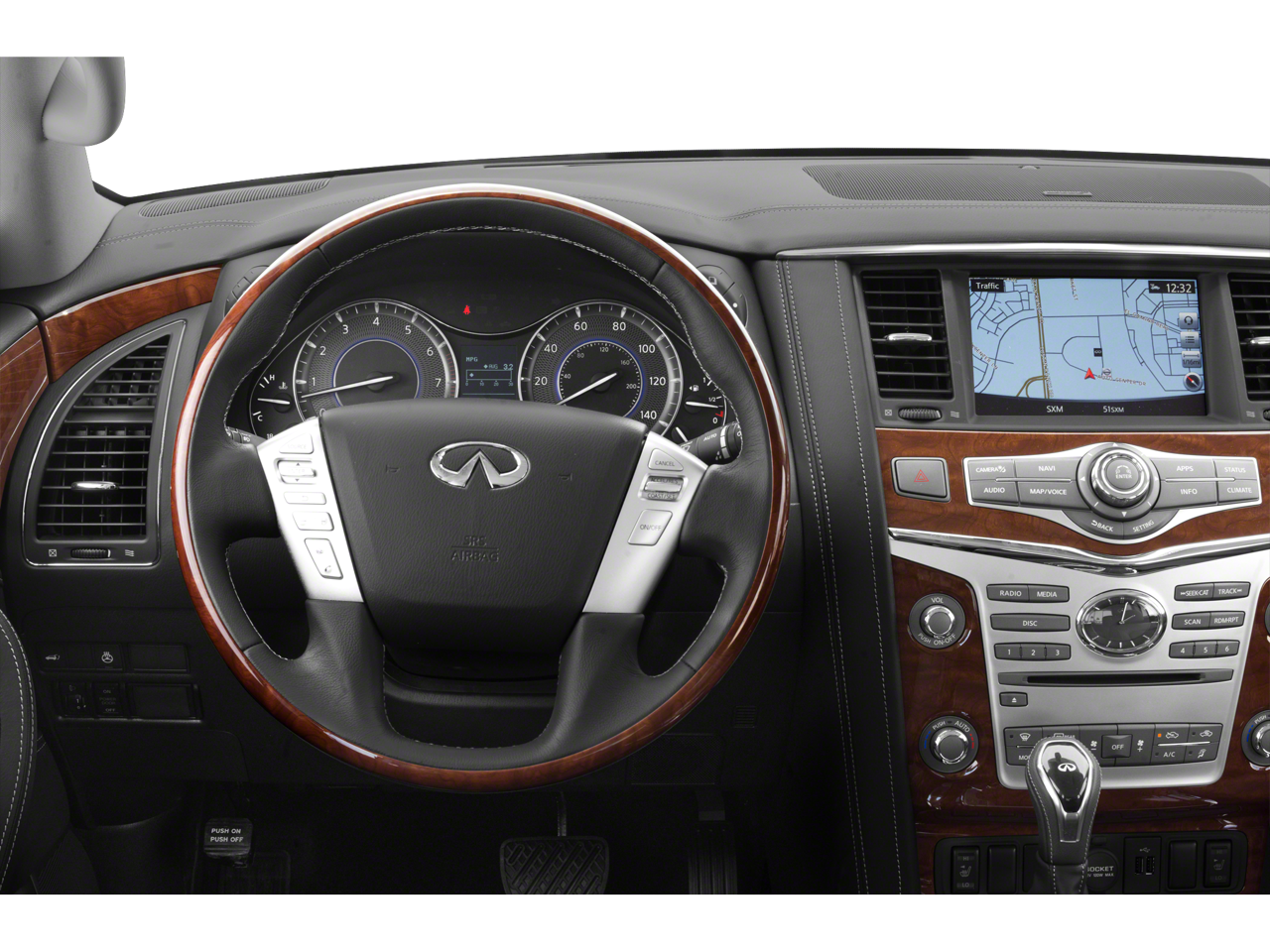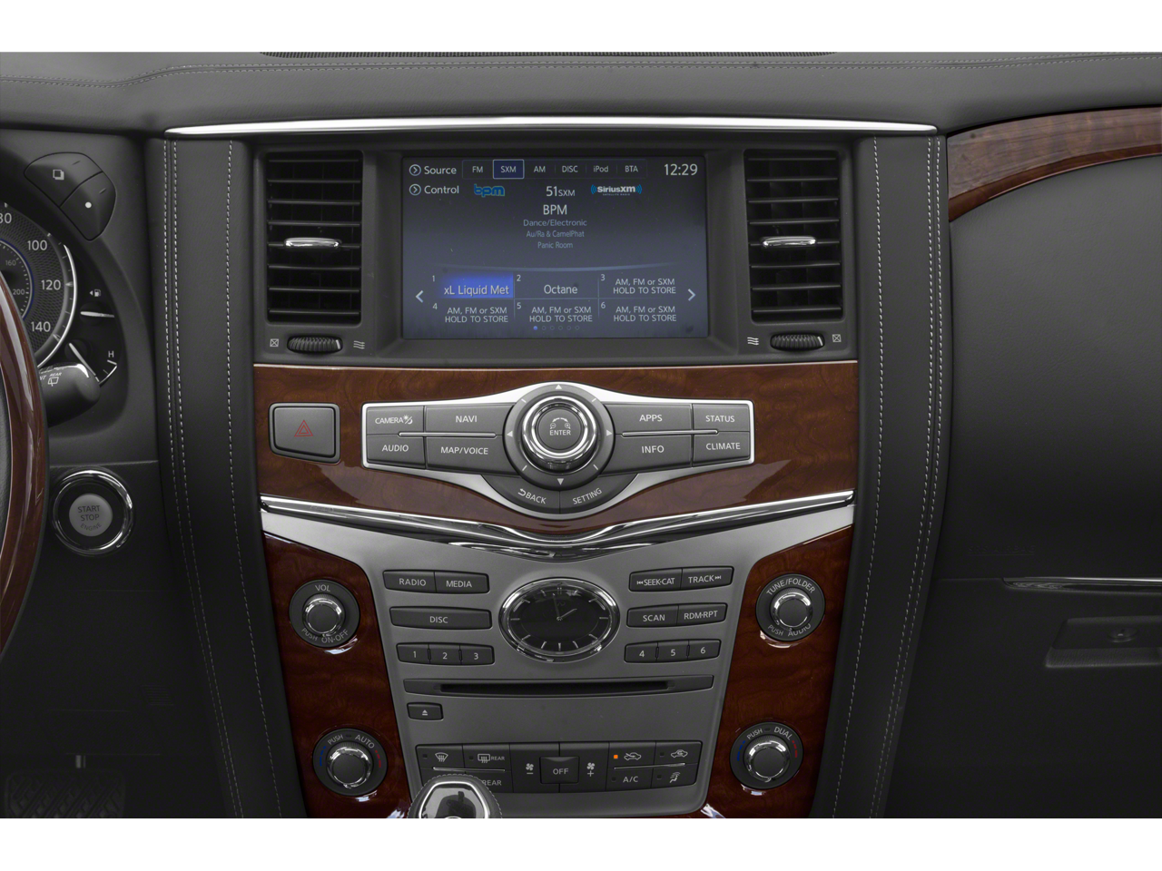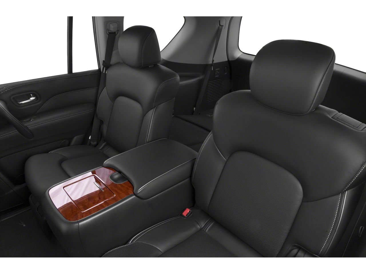 22 Wheel Package (Wheels: 22 x 8.0 14-Spoke Forged Aluminum-Alloy), All-Season Package (All-Season Floor Mats and Cargo Area Mat), Cargo Package (First-Aid Kit, High-Density Non-Slip Rear Cargo Carpet, and Nylon-Cord Cargo Net), ProACTIVE Package (Adaptive Front Lighting System, Front Pre-Crash Seatbelts, Headlight Washers, Hydraulic Body Motion Control System, Smart Rear View Mirror, and Vehicle Speed-Sensitive Power Steering), ProASSIST Package (Backup Collision Intervention (BCI), Blind Spot Intervention (BSI), Blind Spot Warning, Intelligent Cruise Control (Full-Speed Range), and Lane Departure Warning System), Sensory Package (Advanced Climate Control System, Bose Cabin Surround Sound System, Charcoal/Espresso Burl Trim, Chrome Outside Mirror Caps, Climate-Controlled Front Seats, Heated 2nd-Row Seats, and Semi-Aniline Leather-Appointed Seating w/Quilting), Theater Package (120V Power Outlet, Dual 8 Color Monitors, and Wireless Headphones (2)), 13 Speakers, 2.94 Axle Ratio, 3rd row seats: split-bench, 4-Wheel Disc Brakes, ABS brakes, Air Conditioning, Alloy wheels, AM/FM radio: SiriusXM, Anti-whiplash front head restraints, Auto High-beam Headlights, Auto tilt-away steering wheel, Auto-dimming door mirrors, Auto-dimming Rear-View mirror, Auto-leveling suspension, Automatic temperature control, Brake assist, Bumpers: body-color, CD player, Delay-off headlights, Driver door bin, Driver vanity mirror, Dual front impact airbags, Dual front side impact airbags, DVD-Audio, Electronic Stability Control, Emergency communication system: INFINITI Connection, Four wheel independent suspension, Front anti-roll bar, Front Bucket Seats, Front Center Armrest, Front dual zone A/C, Front fog lights, Front reading lights, Fully automatic headlights, Garage door transmitter: HomeLink, Genuine wood console insert, Genuine wood dashboard insert, Genuine wood door panel insert, Heated door mirrors, Heated Front Bucket Seats, Heated front seats, Heated steering wheel, Illuminated entry, INFINITI 4G WiFi, INFINITI Radiant Welcome Lighting, Leather Shift Knob, Leather steering wheel, Leather-Appointed Seats w/Stratford Burl Trim, Literature Kit, Low tire pressure warning, Memory seat, Navigation system: INFINITI InTouch Navigation, Occupant sensing airbag, Outside temperature display, Overhead airbag, Overhead console, Panic alarm, Passenger door bin, Passenger vanity mirror, Power door mirrors, Power driver seat, Power Liftgate, Power moonroof, Power passenger seat, Power steering, Power windows, Radiant Illuminated Kick Plates, Radio data system, Radio: AM/FM/HD w/Single In-Dash CD/DVD Player & MP3, Rain sensing wipers, Rear air conditioning, Rear anti-roll bar, Rear audio controls, Rear reading lights, Rear seat center armrest, Rear window defroster, Rear window wiper, Reclining 3rd row seat, Remote keyless entry, Roof rack: rails only, Roof Rail Cross Bars, Security system, Speed control, Speed-sensing steering, Split folding rear seat, Spoiler, Steering wheel memory, Steering wheel mounted audio controls, Tachometer, Telescoping steering wheel, Tilt steering wheel, Traction control, Trip computer, Turn signal indicator mirrors, Variably intermittent wipers, Voltmeter, and Wheels: 20 x 8.0 Aluminum-Alloy.