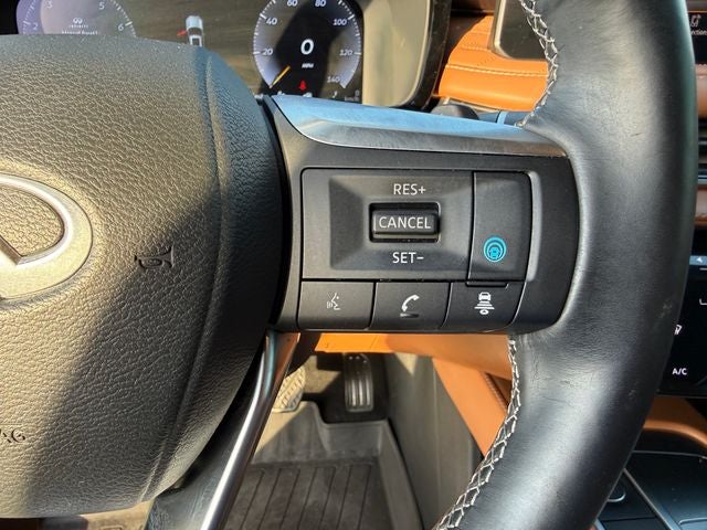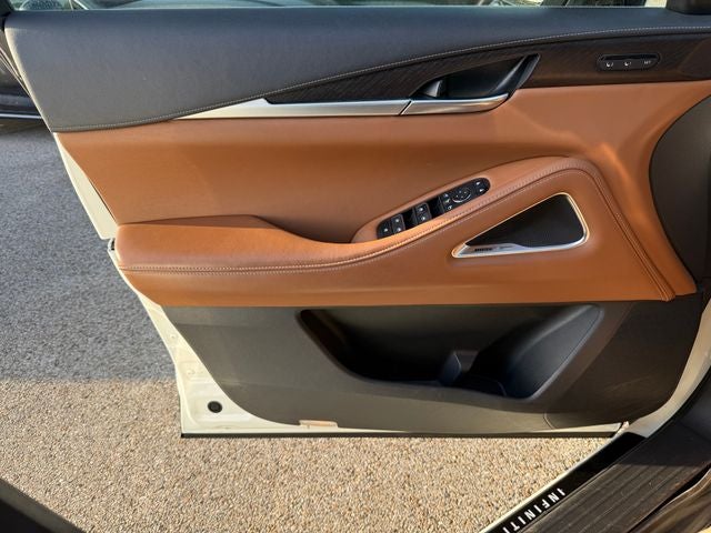 Cargo Package (Cargo Mat (Reversible) and First Aid Kit), Lighting Package w/o Running Boards Installed, 17 Speakers, 3rd row seats: bench, 4-Wheel Disc Brakes, 4.33 Axle Ratio, ABS brakes, Air Conditioning, Alloy wheels, AM/FM radio: SiriusXM, Anti-whiplash front head restraints, Apple CarPlay/Android Auto, Auto High-beam Headlights, Auto tilt-away steering wheel, Auto-dimming door mirrors, Auto-dimming Rear-View mirror, Automatic temperature control, Black-Color Roof Rail Cross Bars, Bose Performance Series 17-Speaker Sound System, Brake assist, Bumpers: body-color, Climate Controlled Front Bucket Seats, Delay-off headlights, Driver door bin, Driver vanity mirror, Dual front impact airbags, Dual front side impact airbags, Electronic Stability Control, Emergency communication system: INFINITI InTouch, Exterior Parking Camera Rear, Four wheel independent suspension, Front anti-roll bar, Front Bucket Seats, Front Center Armrest, Front dual zone A/C, Front reading lights, Fully automatic headlights, Garage door transmitter: HomeLink, Heads-Up Display, Heated door mirrors, Heated front seats, Heated rear seats, Heated steering wheel, Illuminated entry, Knee airbag, Leather Shift Knob, Leather steering wheel, Low tire pressure warning, Memory seat, Navigation system: INFINITI InTouch Navigation, Occupant sensing airbag, Outside temperature display, Overhead airbag, Overhead console, Panic alarm, Passenger door bin, Passenger vanity mirror, Power door mirrors, Power driver seat, Power Liftgate, Power moonroof, Power passenger seat, Power steering, Power windows, Radiant Grille Emblem, Radio data system, Radio: AM/FM Audio System, Rain sensing wipers, Rear air conditioning, Rear anti-roll bar, Rear reading lights, Rear side impact airbag, Rear window defroster, Rear window wiper, Reclining 3rd row seat, Remote keyless entry, Security system, Semi Aniline Leather-Appointed Seating Surfaces, Speed control, Speed-sensing steering, Speed-Sensitive Wipers, Splash Guards (Set of 4), Split folding rear seat, Spoiler, Steering wheel memory, Steering wheel mounted audio controls, Tachometer, Telescoping steering wheel, Tilt steering wheel, Traction control, Trip computer, Turn signal indicator mirrors, Variably intermittent wipers, Ventilated front seats, and Wheels: 20 x 8J Luxury Machined Aluminum Alloy.